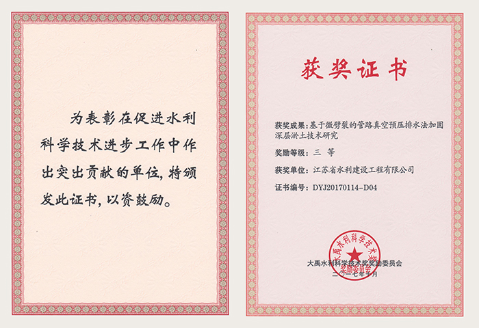 2017大禹水利科學(xué)技術(shù)獎(基于微劈裂的管路真空預壓排水法加固深層淤土技術(shù)研究)