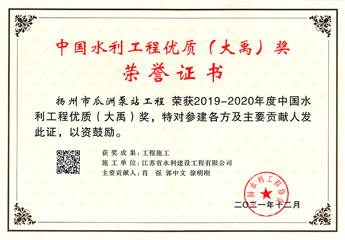 2019-2020中國水利工程優(yōu)質(zhì)(大禹)獎(揚州市瓜洲泵站工程)