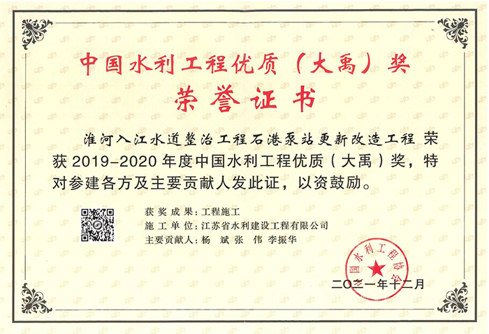 2019-2020中國水利工程優(yōu)質(zhì)(大禹)獎(淮河入江水道整治工程石港泵站更新改造工程)