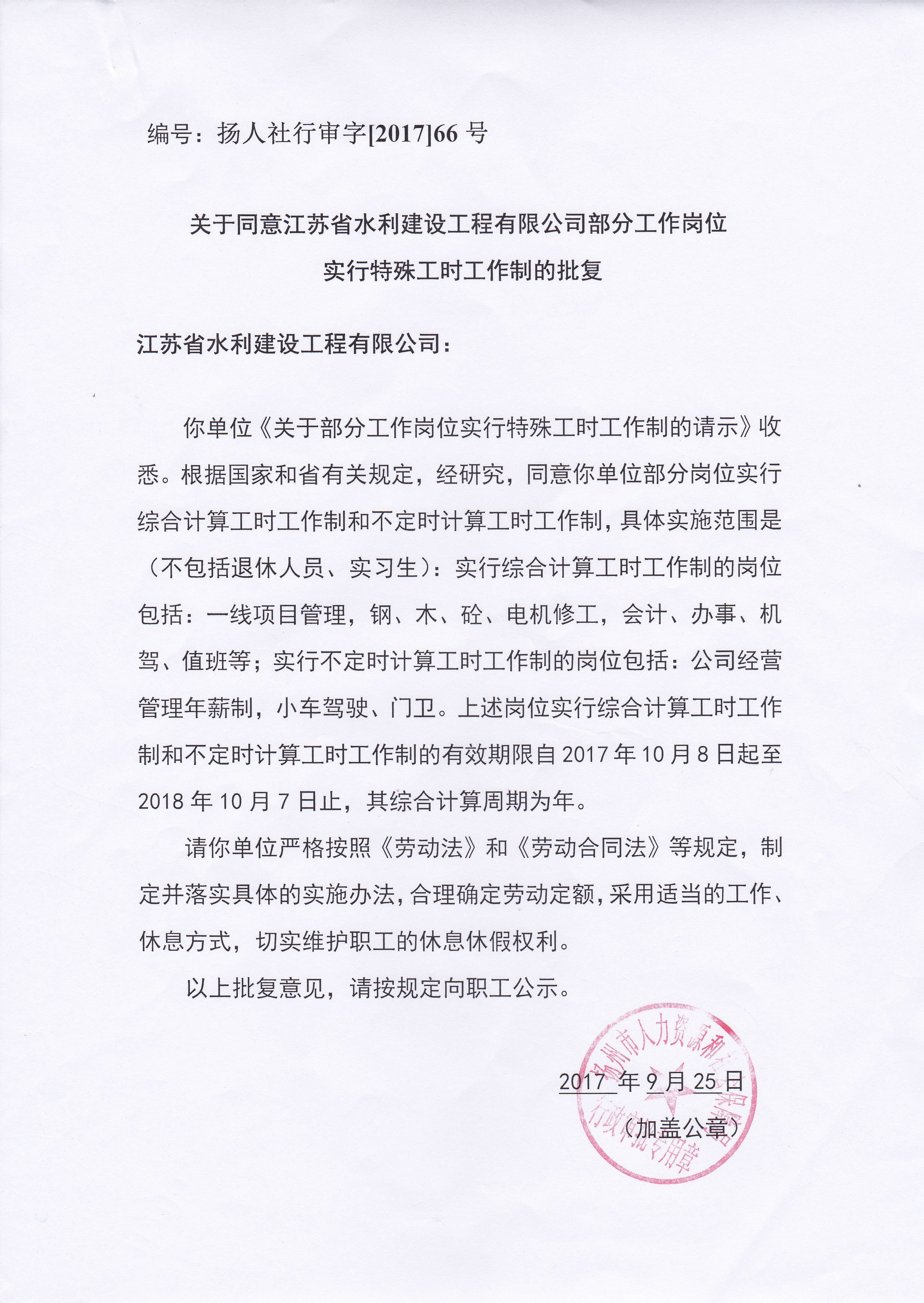 關(guān)于同意江蘇省水利建設(shè)工程有限公司部分工作崗位實(shí)行特殊工時(shí)工作制的批復(fù)