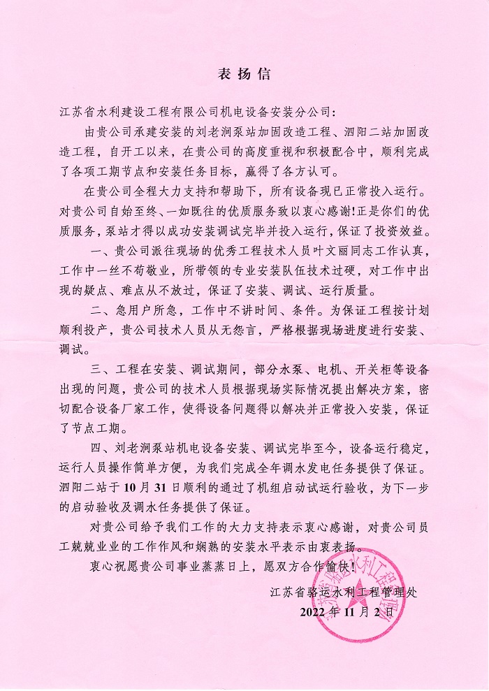 11月2日,江蘇省駱運(yùn)水利工程管理處發(fā)來《表揚(yáng)信》,對(duì)機(jī)安分公司承建的劉老澗泵站加固改造工程、泗陽二站加固改造工程順利完成工期節(jié)點(diǎn)和安裝任務(wù)目標(biāo)給予高度評(píng)價(jià),表揚(yáng)了公司安裝技術(shù)人員特別是葉文麗同志的出色表現(xiàn),向公司表示感謝和祝愿。