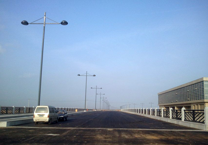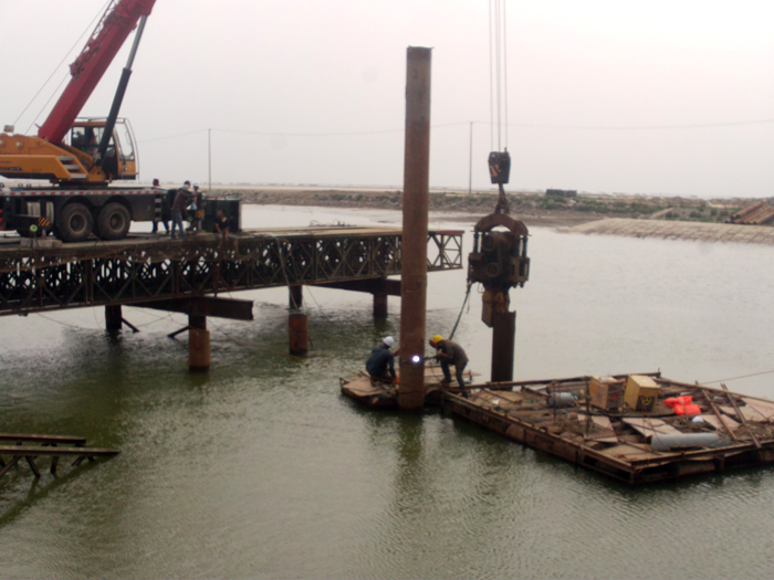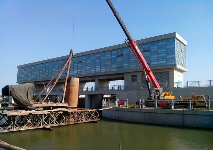 而全橋36根40多米深的鉆孔灌注樁施工因其地質(zhì)復雜多變、未知因素多,成為施工第一難點和焦點,尤其是地處河道深水區(qū)的12個橋墩的灌注樁施工更是異常艱難。同時新城閘還是連云新城地區(qū)唯一能在汛期發(fā)揮城市防汛排澇的水閘,汛期必須保證正常運行。項目部根據(jù)施工現(xiàn)場地質(zhì)條件,經(jīng)過多個方案比選,最終采用了搭建水上平臺施工方案,在河道上搭設(shè)鋼便橋進行鉆孔,保證新城閘在汛期也能正常運行。由于地質(zhì)條件復雜多變,再加上特殊的施工環(huán)境造成的護筒內(nèi)外的特殊壓力差,因此,必須抓好施工過程控制,及時處理特殊事件,以確保工程順利進行。當進行到最后一個橋墩灌注樁作業(yè)時,成孔作業(yè)在水下30多米深發(fā)生了塌孔現(xiàn)象,錘頭被埋在下面。盡管項目部想盡了辦法,也沒能撈出錘頭。但時間不等人,項目部當機立斷,放棄錘頭打撈,重新購置了一只價值6萬多的錘頭繼續(xù)作業(yè)。