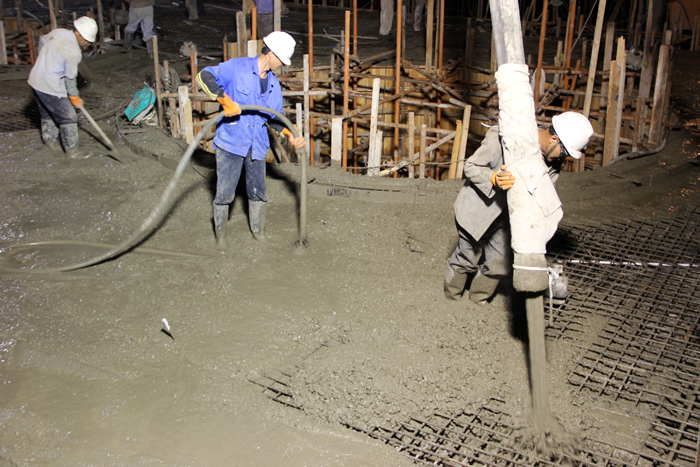 在得知石港泵站項(xiàng)目部的困境后,引江河二線船閘工程項(xiàng)目部主動(dòng)伸出了援助之手。公司副總經(jīng)理、項(xiàng)目經(jīng)理顧明如親自組織,在引江河二線船閘工程即將進(jìn)行水下工程驗(yàn)收的關(guān)鍵時(shí)刻,抽調(diào)了30名混凝土工馳援石港泵站。3月29日16時(shí)30分,引江河二線船閘項(xiàng)目副經(jīng)理肖強(qiáng)帶領(lǐng)30名施工人員來到現(xiàn)場。一下車就立即來到會(huì)議室,接受安全、技術(shù)交底。17時(shí)55分,兩項(xiàng)目部施工人員進(jìn)入現(xiàn)場,準(zhǔn)備就緒。18時(shí),燈火通明,泵聲隆隆,揭開了石港泵站進(jìn)水流道層混凝土澆筑的序幕。