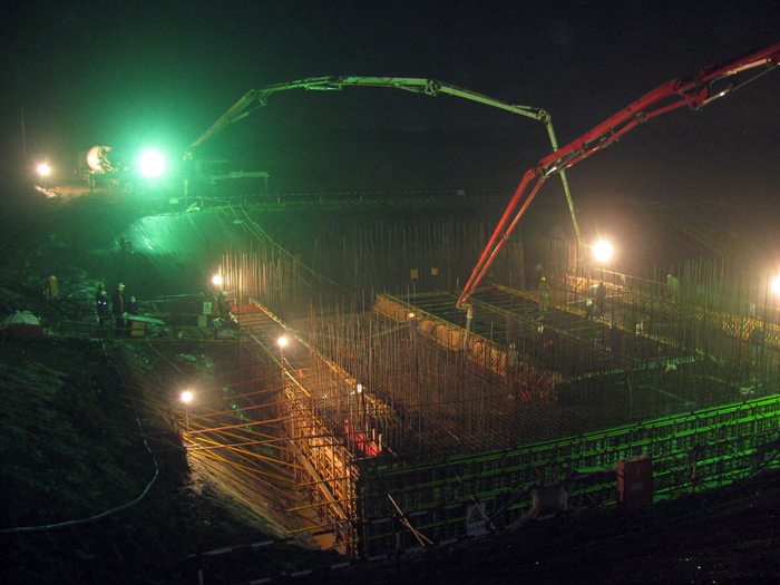 下午16時18分,首塊混凝土底板(下閘首底板)開倉澆筑,經(jīng)過3個班次19個小時的連續(xù)澆筑,到次日上午11時順利完成,累計澆筑混凝土