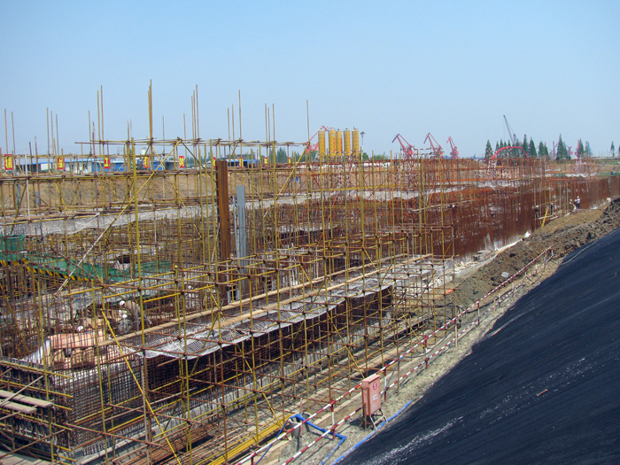 在勞模團(tuán)隊(duì)的帶領(lǐng)下,新溝河江邊樞紐工程迎來了第二個(gè)重要工程節(jié)點(diǎn):上、下閘首及閘室共14塊底板混凝土全部澆筑完成,進(jìn)入船閘上部結(jié)構(gòu)施工階段。截止