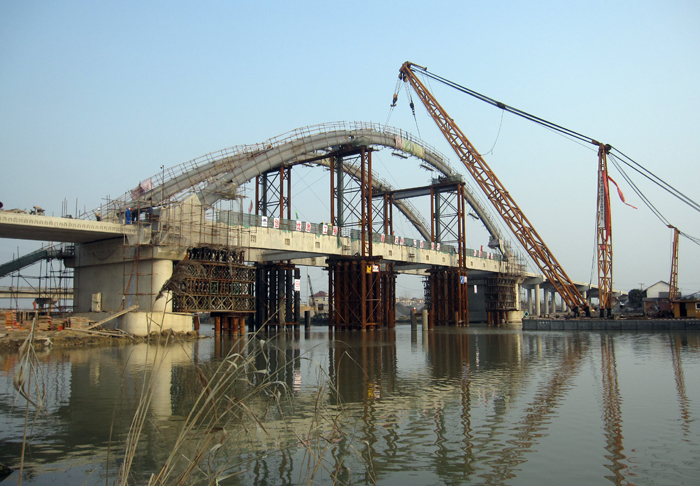 港口公路橋全長451.6米,主跨為85米鋼管系桿拱結(jié)構(gòu),引橋為20米預應力空心板梁。主跨采用三跨四支點施工工藝,支點處現(xiàn)澆濕接頭,最后整體張拉,成橋后拆除四個臨時支點。自2011年11月開工以來,項目部在公司各級領導的關心支持下,狠抓工程施工管理,優(yōu)化施工工藝,解決多種技術難題,減小了施工難度,節(jié)約了施工成本,降低了安全風險,保質(zhì)保量保安全完成工程任務。