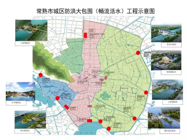 常熟市城區(qū)防洪大包圍工程是根據(jù)常熟市防洪排澇的總體布局,結(jié)合城區(qū)暢流活水項(xiàng)目建設(shè),按照防洪100年一遇、排澇20年一遇的標(biāo)準(zhǔn),新建常滸河樞紐、青墩塘樞紐、白茆塘樞紐、肖涇港閘站、橫涇塘東閘站、橫涇塘西閘、元和塘閘、太平港閘站、山前塘閘站、陳涇閘等10處控制性建筑物,與已經(jīng)建成的南福山塘沖污站、耿涇塘南閘、宅前塘閘站一起,形成城區(qū)防洪大包圍圈。通過(guò)科學(xué)調(diào)度、精細(xì)調(diào)控,進(jìn)一步提高城區(qū)防洪排澇能力,改善水環(huán)境質(zhì)量。