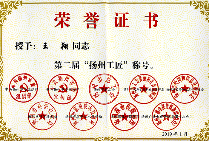 1月25日晚,揚(yáng)州市委、市政府在揚(yáng)州大劇院舉行了2019揚(yáng)州城市榮譽(yù)表彰暨新年聯(lián)歡會(huì),會(huì)上隆重表彰了“揚(yáng)州市十大功臣”、“十大揚(yáng)州好人”、“十大揚(yáng)州大工匠”,我公司機(jī)電安裝分公司王翔同志榮獲“揚(yáng)州工匠”榮譽(yù)稱號(hào)。