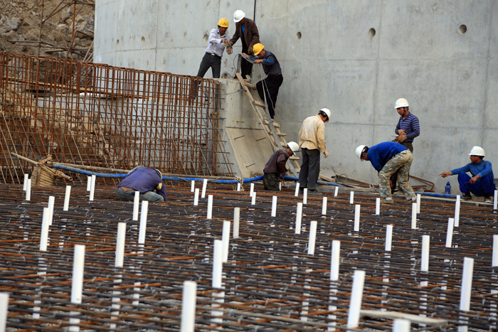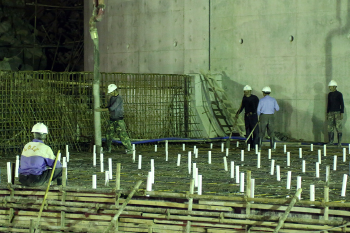 工人們加緊綁扎最后兩塊消力池底板鋼筋,預(yù)計今明兩天澆筑完成