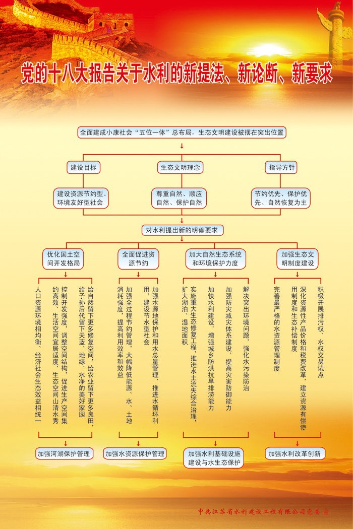 針對江蘇省水利改革發(fā)展和現代化建設的偉大實踐,宣傳牌圍繞2011年中央和省委一號文件的戰(zhàn)略部署,以奮力開啟江蘇水利現代化新征程為統(tǒng)攬,對水利現代化建設的指導思想、發(fā)展目標、總體布局與主要任務、實施方案、保障措施等提出了具體要求,構建出清晰明朗的發(fā)展目標和實施規(guī)劃。
