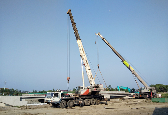 該工程的13座橋梁梁板吊裝是能否順利實(shí)現(xiàn)節(jié)點(diǎn)目標(biāo)的關(guān)鍵。項(xiàng)目部采取了錯(cuò)峰作業(yè)的搶工模式,增加了梁板運(yùn)輸車數(shù)量,并在當(dāng)日前夜完成吊裝梁板上車,次日黎明前將梁板運(yùn)至對應(yīng)橋梁吊裝位置。同時(shí)為避免陰雨天氣影響施工,項(xiàng)目部預(yù)先租用180塊鋼板,作為13座橋梁梁板進(jìn)場道路和100T汽車吊工作平臺。根據(jù)計(jì)劃安排,5月1日已完成跨河橋紅衛(wèi)橋梁板吊裝, 5月3日完成2座支河橋梁板吊裝, 5月4日完成4座支河橋梁板吊裝;梁板吊裝正高效有序、優(yōu)質(zhì)安全的進(jìn)行,將于5月8日前完成所有梁板吊裝施工。