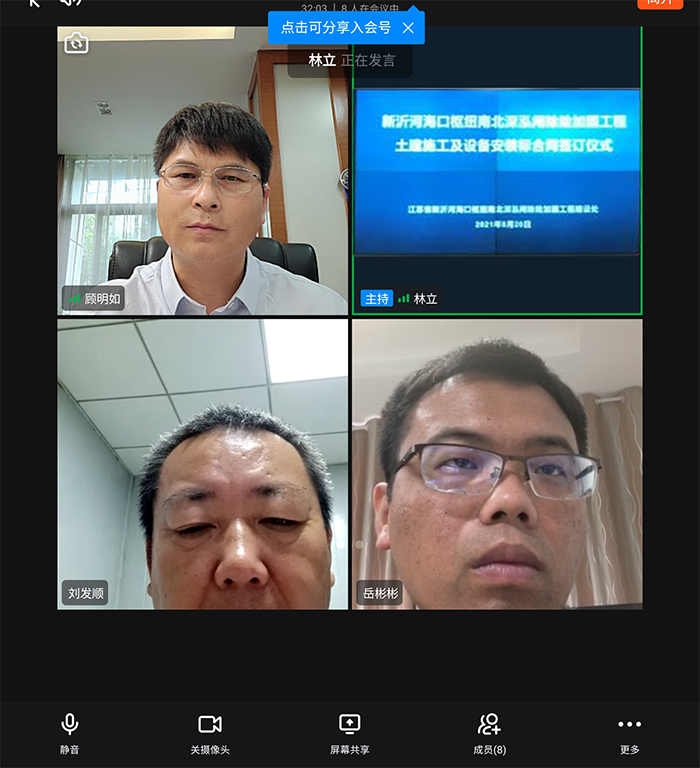 8月20日下午,公司新近中標(biāo)的新沂河海口樞紐南、北深泓閘除險加固工程通過視頻會議的方式舉行合同簽約儀式。省淮沭新河管理處許永平書記、錢邦永副主任、建設(shè)處、監(jiān)理單位領(lǐng)導(dǎo)和公司董事長顧明如等出席了簽約儀式。