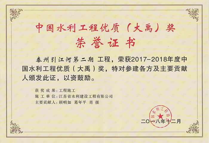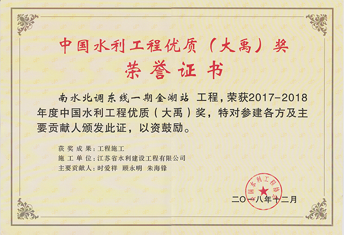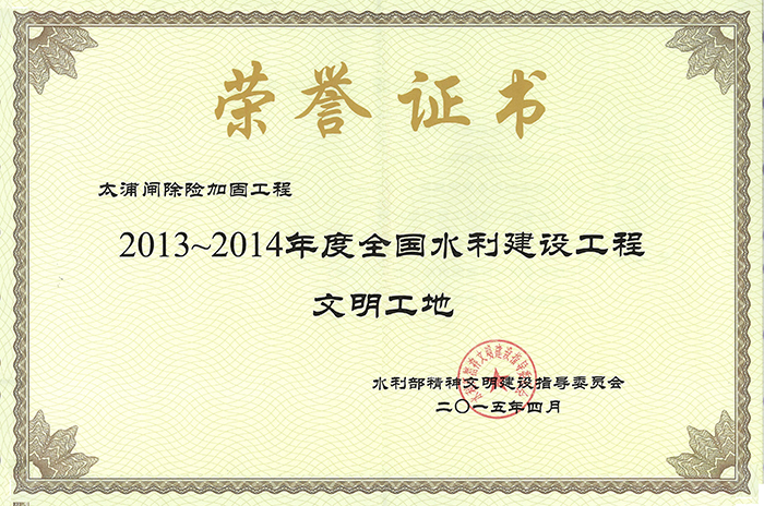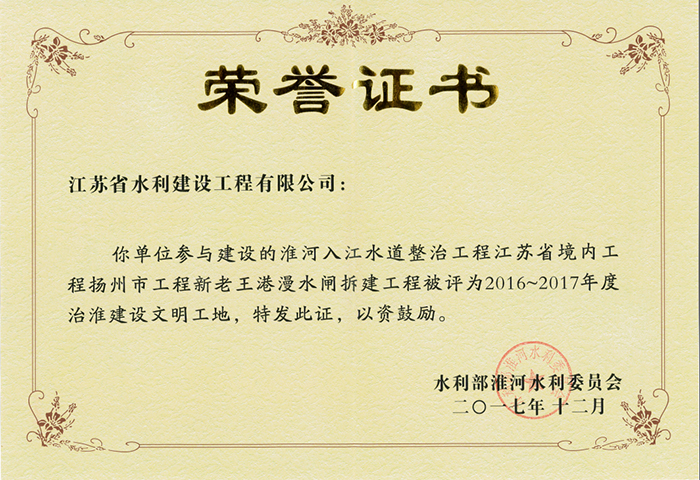 公司連續(xù)多年被評為全國水利建設先進集體、全國優(yōu)秀水利企業(yè)、全國安全生產(chǎn)和質(zhì)量管理先進單位、江蘇省文明單位、建筑業(yè)百強企業(yè),榮獲江蘇省“五一勞動獎章”。