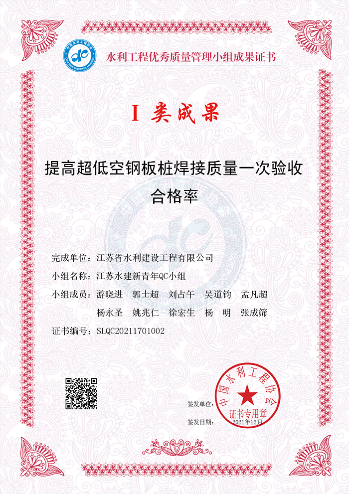 11月27 日,中國水利工程協(xié)會公布了2021年度水利工程優(yōu)秀質量管理小組成果,公司參加發(fā)布的5項QC課題獲評優(yōu)秀質量管理成果獎,其中I類成果1項,II類成果4項。第三工程分公司江蘇水建新青年QC小組現(xiàn)場型QC成果《提高超低空鋼板樁焊接質量一次驗收合格率》榮獲I類成果。