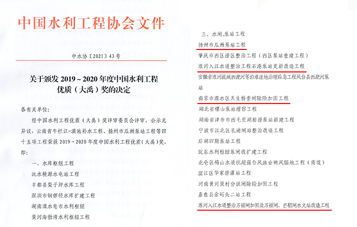 近日,2019~2020年度中國水利工程優(yōu)質(zhì)(大禹)獎評選結(jié)果揭曉,公司承建的揚州市瓜洲泵站工程、淮河入江水道整治工程石港泵站更新改造工程、淮河入江水道整治萬福閘加固及萬福閘、芒稻閘水文站改造工程三項工程獲獎;水機公司參建的淮河入江水道整治工程石港泵站更新改造工程、南京市溧水區(qū)天生橋套閘除險加固工程、淮河入江水道整治萬福閘加固及萬福閘、芒稻閘水文站改造工程三項工程獲獎。