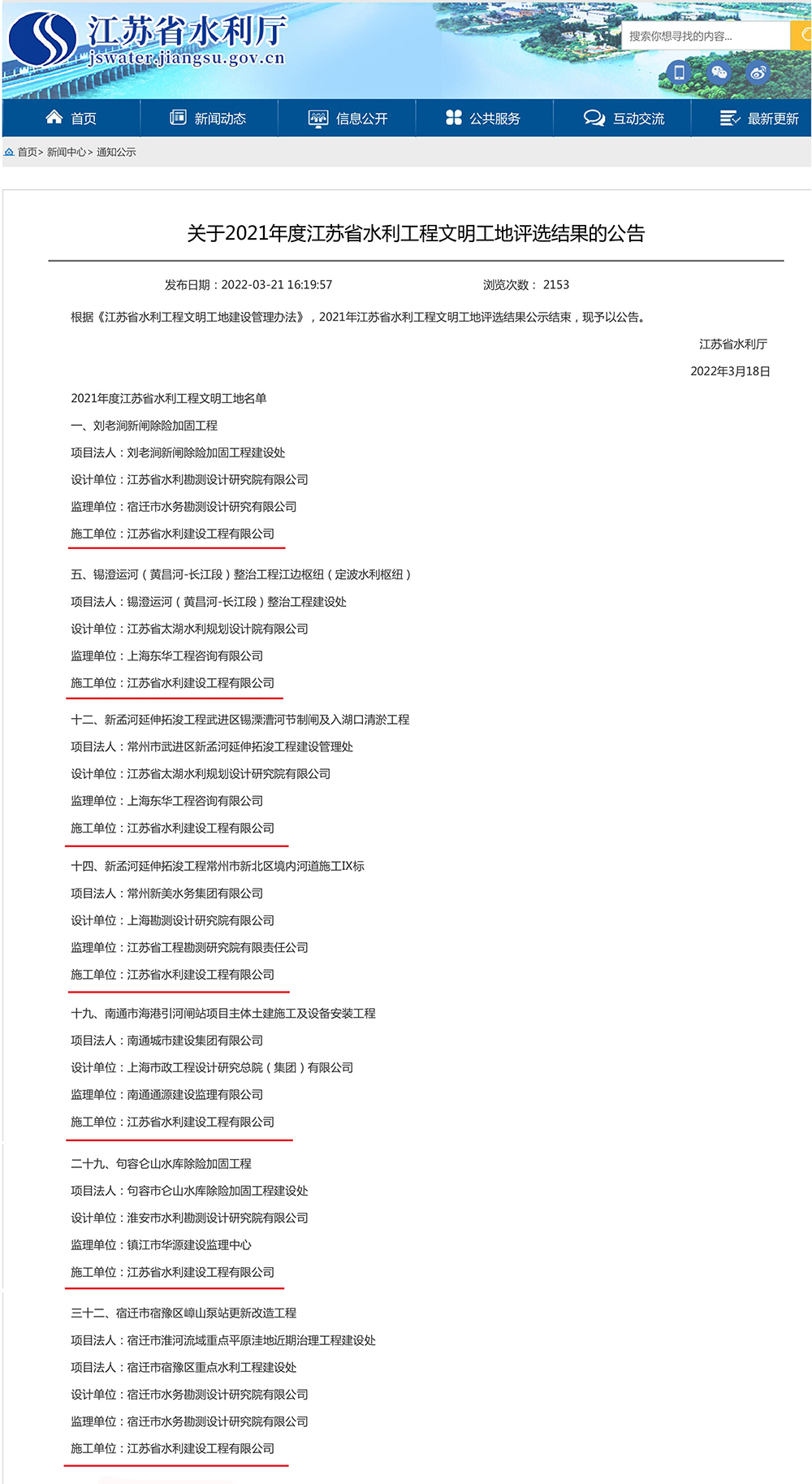 近日,省水利廳公布了2021年度江蘇省水利工程文明工地名單,公司承建的七項(xiàng)工程獲評(píng)省水利工程文明工地。