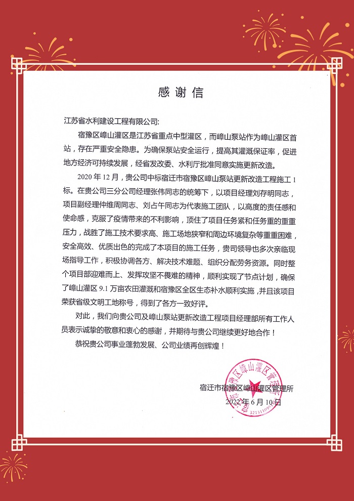 近日,宿遷市宿豫區(qū)嶂山灌區(qū)管理所發(fā)來(lái)《感謝信》,對(duì)我公司承建的宿遷市宿豫區(qū)嶂山泵站更新改造工程施工一標(biāo)出色完成施工任務(wù)給予高度評(píng)價(jià)。