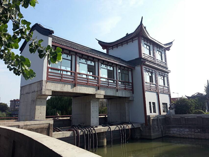 該工程又是邵伯湖大運河故道的北起點。改造后的新閘飛檐翹壁,古韻濃郁,現(xiàn)代水利功能建筑與古典建筑交相輝映。
