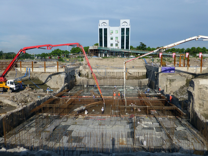 上閘首底板位于泰州引江河二線船閘的上游,左側(cè)是一線船閘上閘首,一、二線船閘縱向中心線距離僅70m;底板底高層▽-8.1。按照施工工藝是在上閘首采用圍封地連墻進行基坑支護,基坑開挖后進行底板施工。7月15日,基坑開挖到位并封底。為減少基坑暴露對一線船閘的影響,全體施工人員頂焦陽、冒酷暑,日夜奮戰(zhàn)。7月22日完成了基坑內(nèi)所有樁頭鑿除、止水安裝等底板施工前準(zhǔn)備工作,7月30日300多噸底板鋼筋綁扎完成?;炷链鬂仓?/SPAN>7月30日下午6時開倉,分左中右三塊穿插進行。至8月2日上午9時,已完成左右兩塊,共澆筑混凝土約2800方。目前中間部位的底板正在澆筑中。
