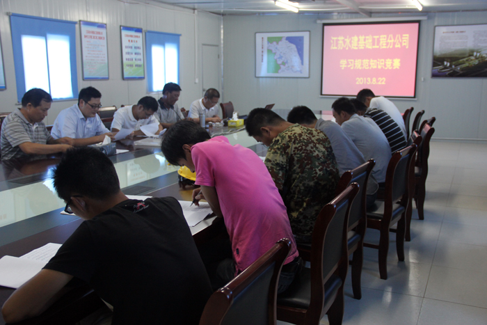 為響應(yīng)省水利廳關(guān)于《加強(qiáng)質(zhì)量強(qiáng)水建設(shè)的指導(dǎo)意見》的通知精神,迎接公司開展2013年“質(zhì)量月”活動(dòng),達(dá)到全員自覺參與質(zhì)量管理、提高工程質(zhì)量管理水平的目的,基礎(chǔ)工程分公司5~8月份組織開展了“學(xué)習(xí)規(guī)范”知識(shí)競(jìng)賽活動(dòng)。根據(jù)工程分散、人員不能相對(duì)集中的情況,基礎(chǔ)工程分公司通過發(fā)動(dòng)宣傳、組織學(xué)習(xí)、分片考試等形式,組織人員學(xué)習(xí)質(zhì)量管理知識(shí),檢驗(yàn)學(xué)習(xí)教育成效。目前,活動(dòng)第一季——《建筑樁基技術(shù)規(guī)范》(JGJ94-2008)知識(shí)競(jìng)賽于