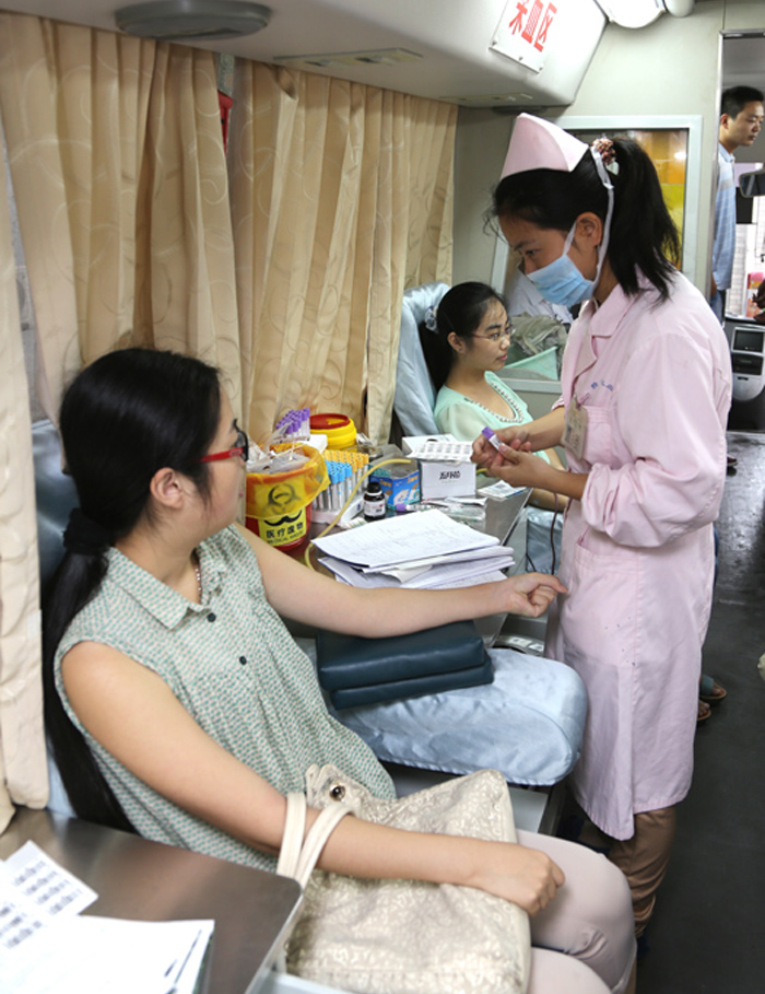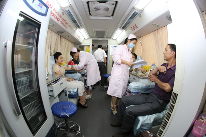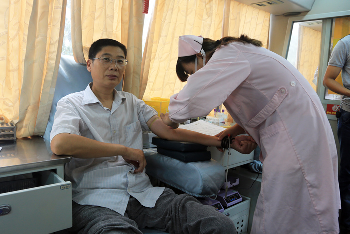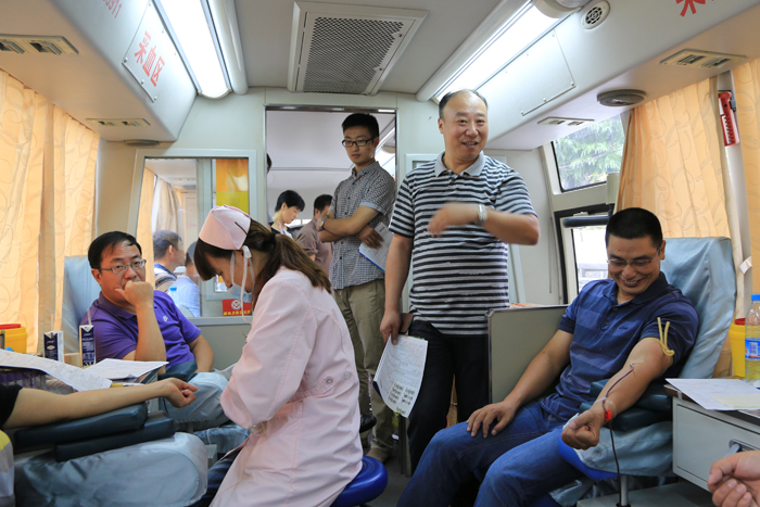 獻血現(xiàn)場,獻血員工在采血車前排隊,主動配合醫(yī)護人員進行逐項檢查,填表、體檢、驗血、采血,整個獻血過程有條不紊、秩序井然。在揚公司領(lǐng)導(dǎo)夏國春、陳勤、許國安、姜啟生來到現(xiàn)場指導(dǎo)慰問,并帶頭無償獻血。