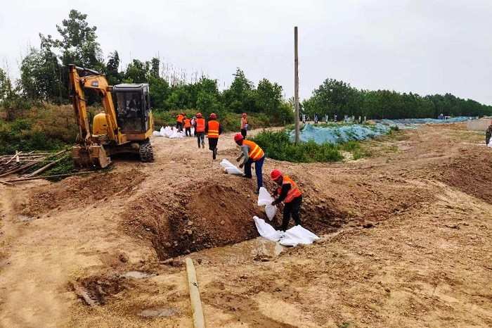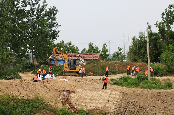 本次演練設(shè)置了消防、觸電、高處墜落、溺水、應(yīng)急照明、L型擋板組裝擋水、土工布反濾法排除滲漏、應(yīng)急排水以及圍堰缺口處理及加固9個(gè)科目。分公司15名搶險(xiǎn)隊(duì)員參加圍堰缺口處理及加固科目演練。演練模擬古山河閘臨湖側(cè)施工圍堰出現(xiàn)滲流、漫溢等險(xiǎn)情,項(xiàng)目部接到搶險(xiǎn)指令后,立即組織搶險(xiǎn)隊(duì)員按照應(yīng)急預(yù)案進(jìn)行搶險(xiǎn)。采用蓋堵法對(duì)圍堰缺口部位進(jìn)行搶護(hù),人工裝填砂袋運(yùn)往圍堰缺口處,配合挖掘機(jī)填筑并加固圍堰缺口。在搶險(xiǎn)隊(duì)員的緊密協(xié)作下,15分鐘就填筑加固了圍堰缺口,保障了堤防安全。