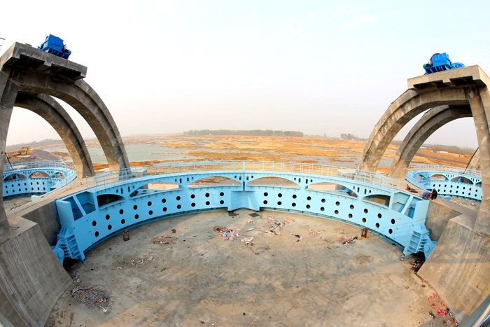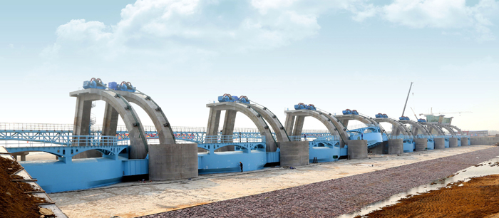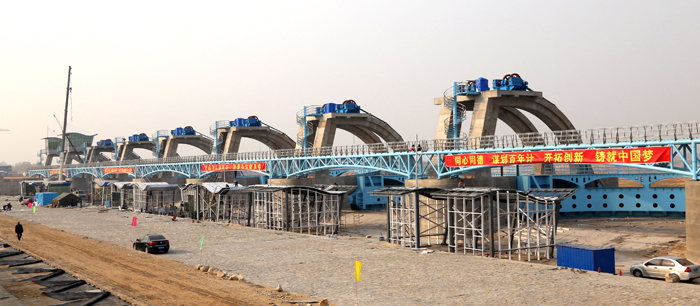 4月16日,由江蘇省水利機械制造有限公司承建的亞洲最大的水利攔河閘壩工程——青島市大沽河水資源開發(fā)利用工程通過水下驗收。該項目是青島治河史上規(guī)模最大、周期最長、檔次最高的綜合性基礎建設項目,總投資額1.2億元,金屬結構共3000噸,5600萬元,包括9扇25M×3.5M護鏡式鋼閘門及9臺套2×1250KN盤香式卷揚啟閉機,閘門頂部設置人行橋;下游側配套9座人行鋼橋。該攔河閘壩工程被譽為亞洲第一壩。