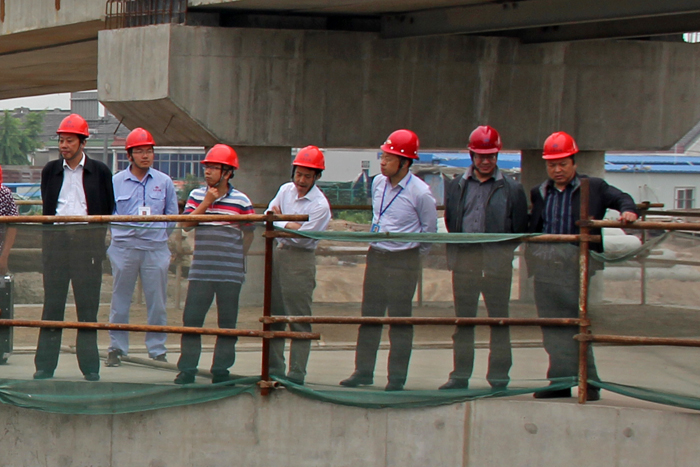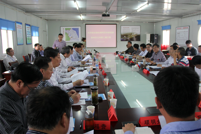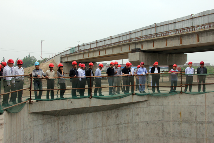 下午,觀摩團來到了泰州引江河二期工程,在江蘇省水利廳黨組成員、省水利建設局局長朱海生、引江河二期工程建設局局長馬志華陪同下參觀了由我公司施工的河道工程一標和二線船閘工程,公司董事長夏國春和副總經理、二線船閘項目經理顧明如、機械化分公司經理、河道一標項目經理葛年平陪同參觀并介紹了工程施工情況。隨后,觀摩團在項目部會議室,觀看了引江河二期工程宣傳片,聽取了馬志華對引江河二期工程施工管理情況介紹和顧明如對二線船閘工程進度、施工難點、技術創(chuàng)新和質量管理等情況的介紹。