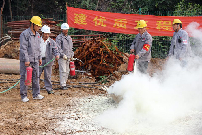 施工現(xiàn)場的東南角方向火光烈烈、濃煙滾滾,消防隊(duì)隊(duì)員們提著滅火器,從不同方向迅速沖向著火點(diǎn),敏捷地打開滅火器開關(guān),瞬間一條條白色霧狀的滅火粉噴向火場,一場“大火”很快被撲滅。