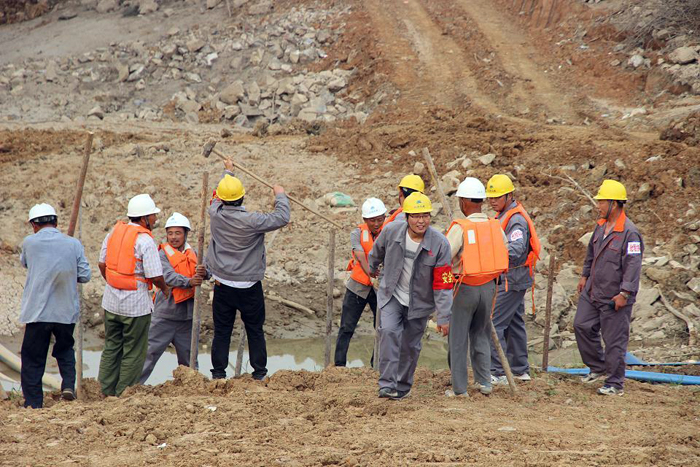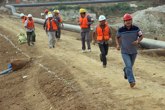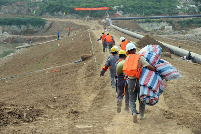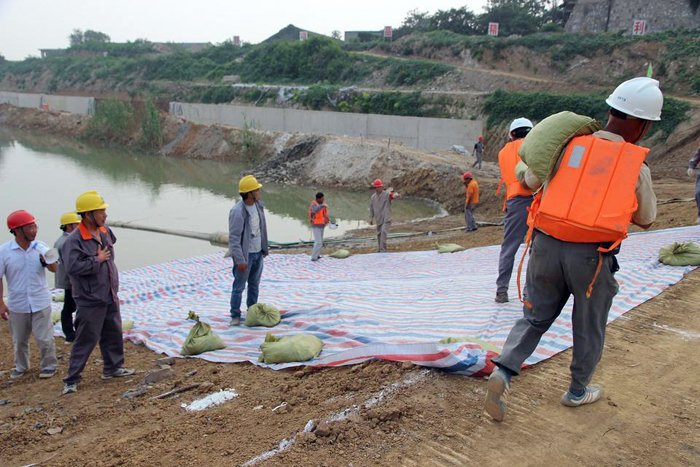 第一搶險(xiǎn)小組隊(duì)員將土裝袋后人抬肩扛,源源不斷地向堰頂運(yùn)送加打子堰,阻擋即將漫過圍堰的洪水;第二搶險(xiǎn)小組迅速在圍堰西南角迎水面鋪設(shè)并壓實(shí)彩條布阻塞管涌;第三搶險(xiǎn)小組近十名搶險(xiǎn)隊(duì)員,奮不顧身地沖向發(fā)生滑坡險(xiǎn)情的圍堰背水坡面,打樁填土,對圍堰滑坡面進(jìn)行加固。裝載機(jī)、挖掘機(jī)也揮動有力的臂膀向圍堰上運(yùn)土、抓土、填土,并進(jìn)行碾壓作業(yè)……此時(shí),搶險(xiǎn)現(xiàn)場的鐵錘敲擊聲、機(jī)械轟鳴聲和搶險(xiǎn)隊(duì)員們相互配合的號子聲,匯成了一曲項(xiàng)目部全體員工眾志成城、不畏艱險(xiǎn)的團(tuán)結(jié)戰(zhàn)斗的樂章。