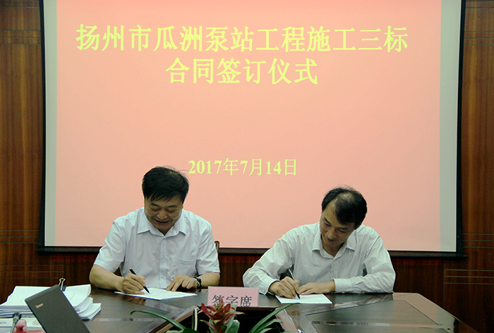 7月14日下午,揚州市瓜州泵站主體工程合同簽訂儀式在揚州市水利局舉行,揚州市水利局副局長凌國棟、瓜洲泵站建設處相關領導、中標單位代表出席了簽訂儀式。公司董事長時愛祥參加活動并簽訂合同。