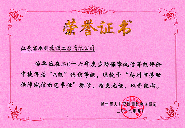 近日,公司在揚(yáng)州人力資源和社會(huì)保障局2016年度勞動(dòng)保障誠(chéng)信等級(jí)評(píng)價(jià)中被評(píng)為“A級(jí)”誠(chéng)信等級(jí),再次被授予“揚(yáng)州市勞動(dòng)保障誠(chéng)信示范單位”稱號(hào)。