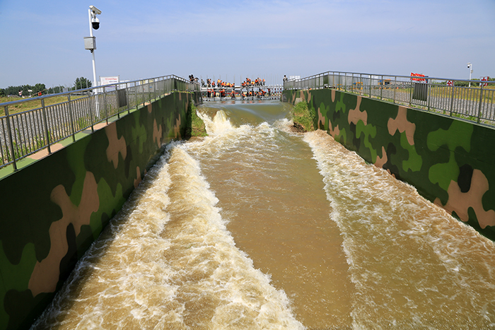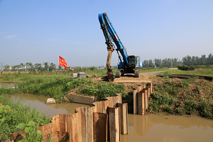 洶涌的水流沖破堤壩直泄而來(lái),雖然是演習(xí)預(yù)設(shè)場(chǎng)景,但水流的沖擊力不亞于真實(shí)的決堤搶險(xiǎn)。公司的隊(duì)員立即行動(dòng)起來(lái),植樁機(jī)拉起鋼板樁,隨著一陣陣錘擊聲,鋼板樁迅速插向決口,決口逐漸縮小。十多分鐘后,一道堅(jiān)固的鋼板樁圍堰攔阻住了肆虐的水流,決口封堵取得了圓滿(mǎn)的成功。