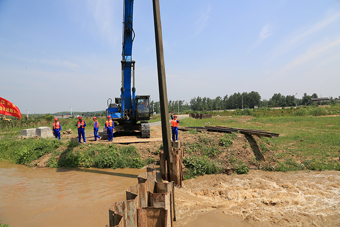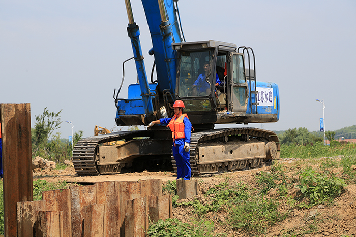 公司此次參加演練的科目是組織大型鋼板樁封堵決口課目演示。我公司是省級(jí)防汛抗旱物資委儲(chǔ)單位,儲(chǔ)備了一批鋼管、鋼板樁。參加演練首先檢驗(yàn)的是我公司對(duì)委儲(chǔ)物資的調(diào)運(yùn)協(xié)調(diào)能力。23日,在設(shè)備租賃分公司的支持下,30余噸鋼板樁和植樁機(jī)等大型機(jī)械,按照《防汛物資緊急調(diào)運(yùn)預(yù)案》在規(guī)定時(shí)間內(nèi)到達(dá)演練指定位置,并進(jìn)行了預(yù)演施工。