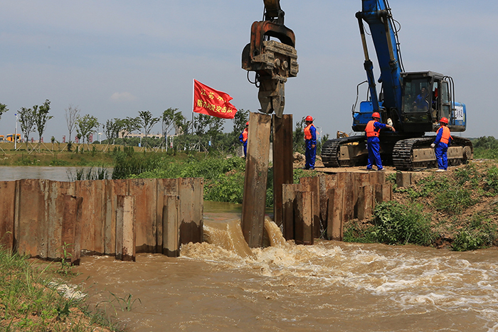 9時(shí)50分,指揮部接報(bào),下游發(fā)生潰壩險(xiǎn)情,指揮部立即下令搭建鋼木石土石壩封堵決口,同時(shí)命令江蘇水建防汛搶險(xiǎn)突擊隊(duì)立即開(kāi)展大型鋼板樁植樁封堵作業(yè)。