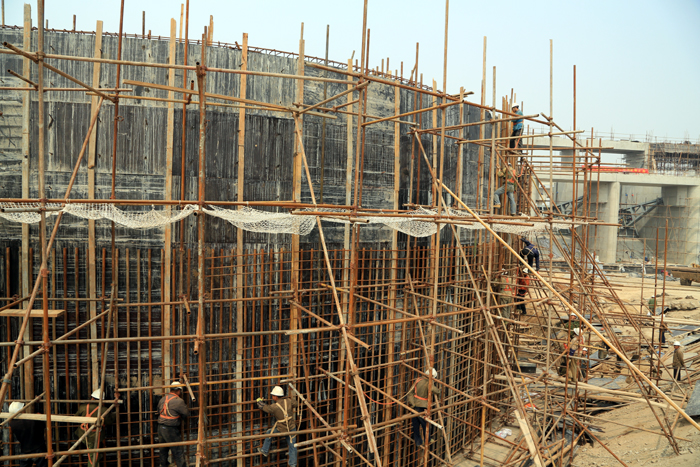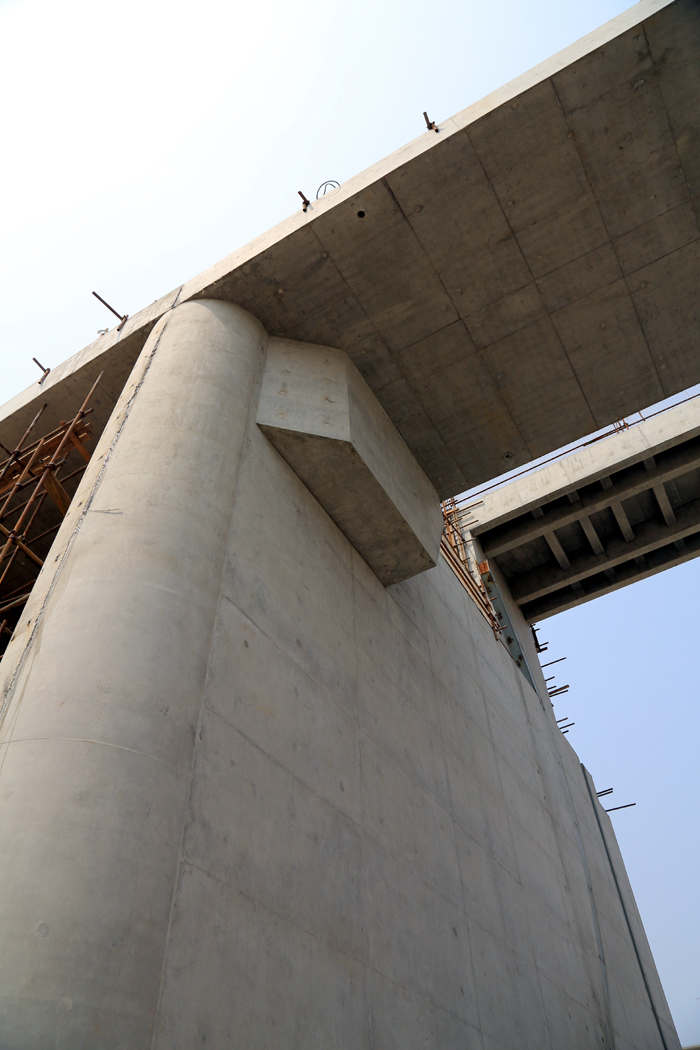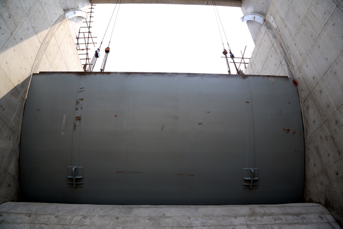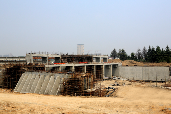 如今站在下游看去,節(jié)制閘已初露崢嶸,閘墩已全部拔地而起,兩側(cè)的翼墻如同雄鷹展翅,光潔的混凝土表面溢著青光,林立的腳手架,穿梭地機械,全副武裝的工人,一切都給人以信心,以希望。