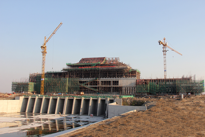 瓜洲泵站主廠房總高 28.5 米,為晚唐設(shè)計(jì)風(fēng)格,既考慮了泵站的功能需要,又突顯了揚(yáng)州古城的建筑風(fēng)貌。泵站主廠房建筑物高大,采用古典結(jié)構(gòu),其縱橫交錯(cuò)、大小不等的屋梁,遠(yuǎn)遠(yuǎn)伸出的屋檐,富有彈性的屋檐曲線,微微起翹的屋角,給施工增加了極大難度。江蘇水建公司項(xiàng)目部的施工人員克服重重困難,發(fā)揮在大型泵站工程建設(shè)中的技術(shù)優(yōu)勢(shì),全力開展技術(shù)攻關(guān),抓質(zhì)量保進(jìn)度,于2019年元旦期間完成了立模、扎筋工作,迎來了主廠房封頂施工的重要節(jié)點(diǎn)。