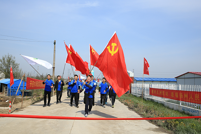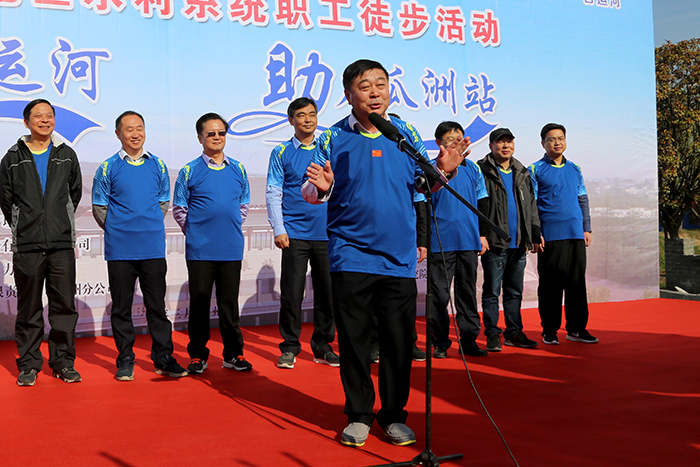 “讓我們用徒步古運(yùn)河的方式為宣傳水利方針政策、宣傳水環(huán)境保護(hù)理念而行動(dòng),一起向著沖刺瓜洲泵站建設(shè)關(guān)鍵階段目標(biāo)而出發(fā)……”,隨著揚(yáng)州水利局黨組書記、局長(zhǎng)康盛君鳴槍發(fā)令,揚(yáng)州地區(qū)水利系統(tǒng)徒步大軍400多人浩浩蕩蕩的從位于古運(yùn)河畔的王小河泵站出發(fā),沿著古運(yùn)河?xùn)|堤向南行進(jìn),直行抵達(dá)終點(diǎn)處瓜洲泵站項(xiàng)目部。