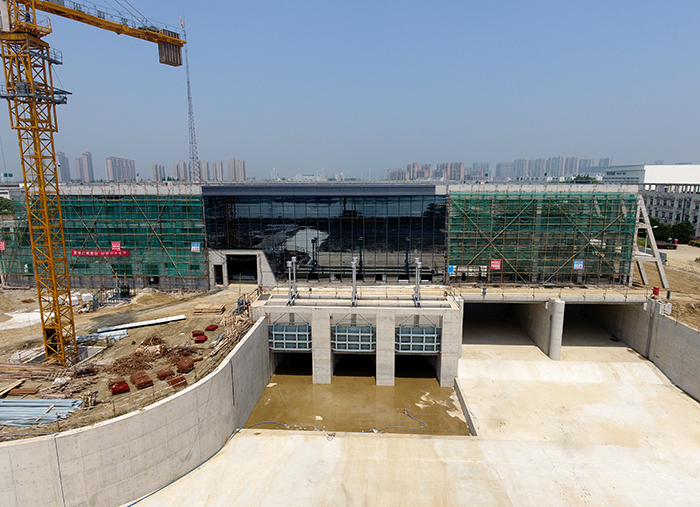 工程于2018年6月10日開工建設(shè),到2019年5月底完成泵站、節(jié)制閘主體及上下游聯(lián)結(jié)段土建施工,完成泵站6扇工作閘門、6套液壓啟閉機(jī)、1扇檢修門、6臺套清污機(jī)、1臺套皮帶機(jī)制安,完成3臺套貫流泵安裝,完成節(jié)制閘2扇工作閘門及2套卷揚(yáng)式啟閉機(jī)制安,完成主副廠房及調(diào)度中心土建施工,具備水下階段驗(yàn)收條件,比原合同工期有所提前;目前正進(jìn)行主副廠房、調(diào)度中心裝飾施工及輔機(jī)設(shè)備安裝調(diào)試工作,擬于2019年9月初具備完工驗(yàn)收條件。