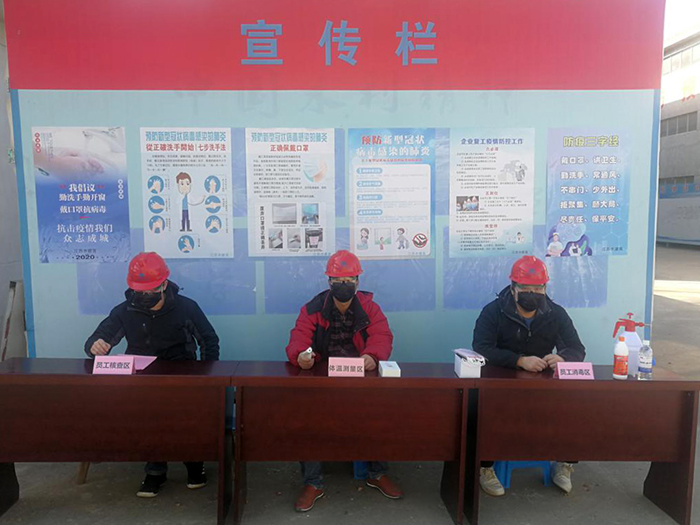 項(xiàng)目管理人員到崗后,及時(shí)申報(bào)復(fù)工方案,開(kāi)展防疫檢查,與政府部門(mén)對(duì)接,有序組織非重點(diǎn)地區(qū)工人進(jìn)場(chǎng)。工地實(shí)行全封閉管理,員工檢測(cè)體溫后登記進(jìn)場(chǎng),設(shè)置隔離間,每日對(duì)項(xiàng)目部辦公、生活區(qū)全面消毒,確保防疫措施一一落實(shí)到位。