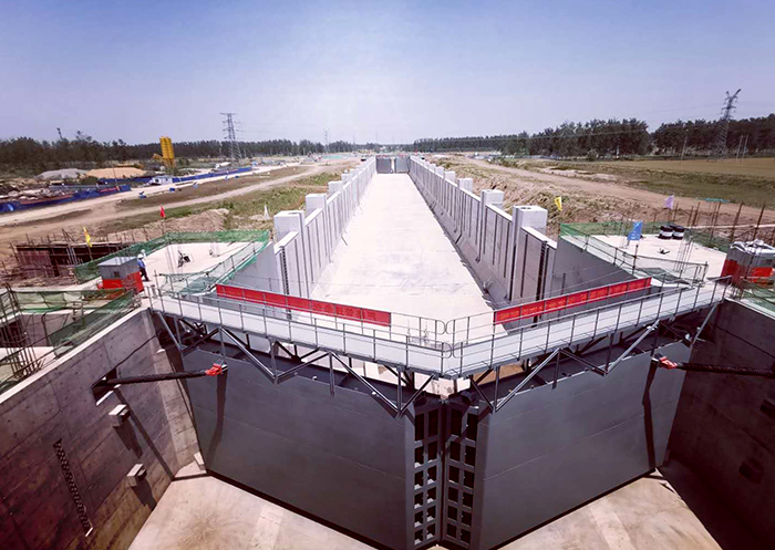 陸運河船閘工程于2017年6月18日正式開工,12月1日完成第一節(jié)閘室底板澆筑,2020年4月25日完成閘室及上下閘首所有二期砼澆筑,5月13日完成閘門及啟閉機安裝調(diào)試,5月15日完成征地范圍內(nèi)水下工程,具備水下已完工程質(zhì)量鑒定條件。