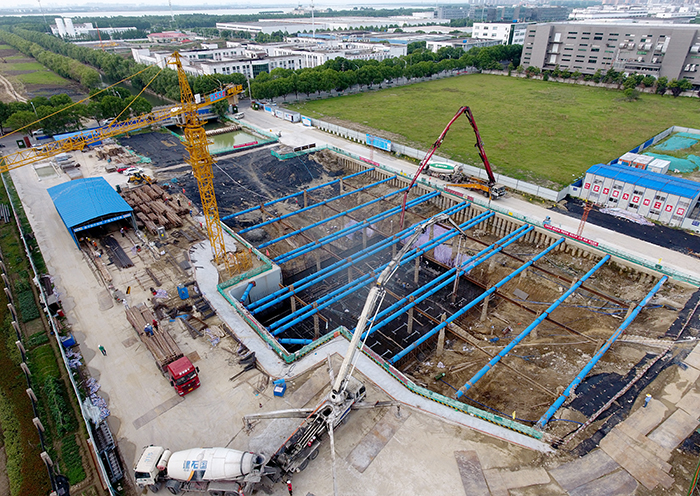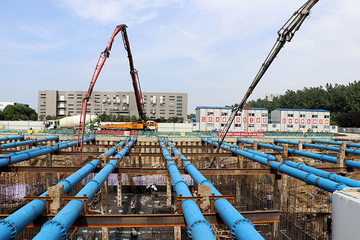 泵站底板作為本項(xiàng)目首次且體量最大的混凝土澆筑,項(xiàng)目部精心策劃,提前召開(kāi)了施工方案討論會(huì),分析技術(shù)難點(diǎn),做好預(yù)防大體積混凝土裂縫控制措施,合理安排任務(wù);加強(qiáng)對(duì)作業(yè)人員技術(shù)和安全交底,全面規(guī)范管理;克服場(chǎng)地狹窄、交通運(yùn)距長(zhǎng)、大體積混凝土施工等施工難點(diǎn),多舉措確保完成本次混凝土澆筑。