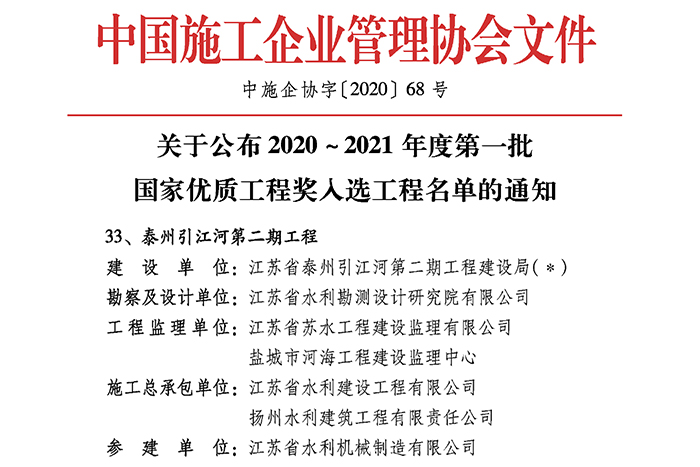 日前,中國施工企業(yè)管理協(xié)會公布了2020—2021年度第一批國家優(yōu)質工程獎獲獎名單,我公司承建的泰州引江河第二期工程榮獲這一工程建設領域跨行業(yè)、跨專業(yè)的國家級質量獎。
