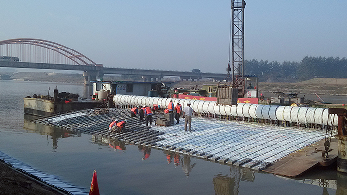 ——河道工程在一期工程基礎上擴建,全線24公里河道向下浚深3米,自流引江規(guī)模從300立方米每秒擴大到600立方米每秒。河道工程項目部制定了高標準的質量目標和創(chuàng)優(yōu)計劃,河道浚深重點解決不斷航施工的矛盾,采用的軟體沉排護岸施工工藝,為江蘇省內河防護項目首次應用;船舶臨時停靠點采用滑模技術,疏浚排泥場應用泥水快速分離試驗成果,實現了安全、高效、環(huán)保施工。