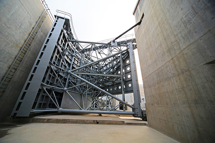 ——二線船閘施工期必須同時保證一線船閘的正常通航和工程安全,不均質地基上的深井降水、閘首開挖的深基坑支護、多種地基和防滲處理結構交叉等技術難題,都在考驗著建設者的智慧和能力。二線船閘上閘首基坑開挖深度近15米,二線與一線船閘中心線相距僅70米,上閘首邊墩相距僅29米,同時還需對運行中的一線船閘上下游導航墻進行加固和改造。工程施工中,項目部在建設局、設計、監(jiān)理和各參建單位的大力支持和幫助下,根據工程“近、深、長、新、全”的特點,開展質量創(chuàng)優(yōu)、技術創(chuàng)新、文明創(chuàng)建和安全達標,全面推動工程攻堅克難,科學施工。