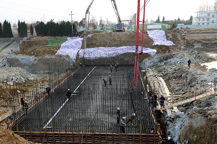 為確保春節(jié)前澆筑工作順利完成,項(xiàng)目部克服工期緊、施工場(chǎng)地狹窄等困難,以及疫情帶來(lái)的不利影響,完成了圍堰填筑、原閘拆除、鋼便橋安裝。施工前,參建各方對(duì)底板的止水、鋼筋、模板、預(yù)埋件及澆筑準(zhǔn)備等各項(xiàng)內(nèi)容進(jìn)行了聯(lián)合驗(yàn)收和檢查,確保各項(xiàng)條件均符合施工要求。
