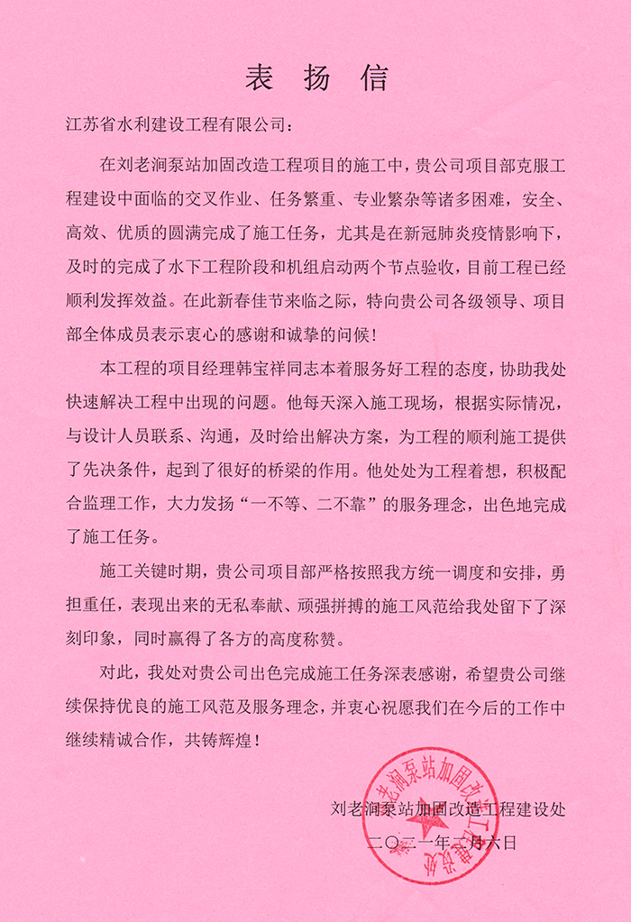 2月6日,劉老澗泵站加固改造工程建設(shè)處發(fā)來(lái)《表?yè)P(yáng)信》,對(duì)我公司承建的劉老澗泵站加固改造工程圓滿完成施工任務(wù)給予高度評(píng)價(jià),表?yè)P(yáng)了項(xiàng)目經(jīng)理韓寶祥同志及項(xiàng)目團(tuán)隊(duì)做出的出色成績(jī),特地向公司表示感謝和祝賀。