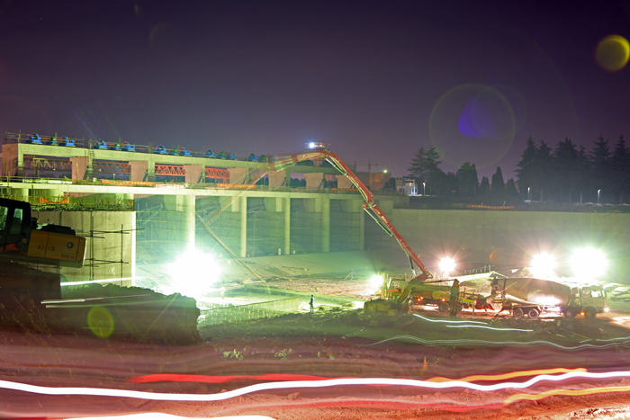科學(xué)的施工調(diào)度管理,果斷的現(xiàn)場(chǎng)決策,使現(xiàn)場(chǎng)多點(diǎn)作業(yè)同步施工,交叉繁忙而井然有序。敬業(yè)的管理隊(duì)伍、熟練的技術(shù)工人,保證了施工效率,實(shí)現(xiàn)了“人、機(jī)、料、法、環(huán)”等各個(gè)要素的有機(jī)融合。施工高峰階段,每天保持兩臺(tái)以上泵車(chē)澆筑混凝土,連續(xù)有上百個(gè)小時(shí)的澆筑強(qiáng)度。在混凝土200多次開(kāi)倉(cāng)澆筑中,幾乎沒(méi)有一次是上午進(jìn)行的,一般都是白天立模晚上澆筑,通宵完成,決不會(huì)拖到第二天。以南二聯(lián)孔(6~7號(hào)孔)施工過(guò)程為例: