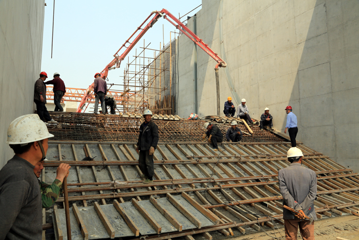 堅(jiān)持技術(shù)交底制度也是加強(qiáng)質(zhì)量控制的重要手段。預(yù)埋件、滾水堰、高支模等復(fù)雜工序,項(xiàng)目部都是先開(kāi)技術(shù)討論會(huì),技術(shù)員與一線工人面對(duì)面討論、交流。實(shí)踐是最好的老師,經(jīng)驗(yàn)成就最好的專家。每一次方案的研究,都是技術(shù)人員提方案,工人師傅們桌面演練,最終集思廣益拍板確定。項(xiàng)目部工程部門(mén)的大學(xué)生們,不得不感嘆在泗陽(yáng)閘不但學(xué)到了東西,更見(jiàn)識(shí)了工人師傅們的實(shí)踐水平。