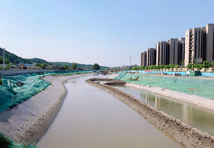 南京市九鄉(xiāng)河治理二期工程施工四標段實施河道長度1100m,加固沿線配套建筑物。該工程由公司機械化工程分公司承建,該工程因拆遷原因,各個工段分五次移交給項目部。其中最后交付施工的五福家園段與小區(qū)只有一墻之隔,且道路狹窄,樁基工程種類較多。施工過程中,項目部委派專人與社區(qū)對接,安裝噴淋霧炮、對施工車輛及道路進行清掃、沖洗,積極協(xié)調、化解居民群眾的矛盾糾紛,有力維護了工程施工期間的平安穩(wěn)定,推動了工程施工進展。截止目前,完成工程量已超90%,剩余工程正在抓緊施工。